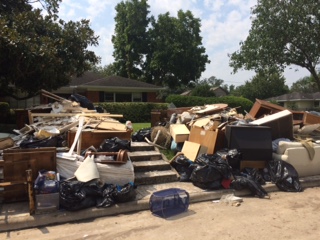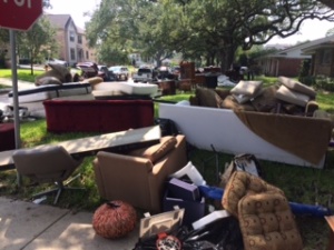 The cleanup process has begun, but not without being an overwhelming and emotional task.  This is my neighborhood, only two streets over closer to the bayou.  After the rain stopped and the water receded (at least in my area), it was time to get to work, no matter how traumatizing and difficult the situation.  My family helped where we could with friends and even strangers – from demolition of drenched sheetrock and wood floors to the removal of waterlogged books, pictures, clothes, valuables, etc.  I stood shoulder to shoulder with a friend of mine as she sorted through her “nerd notes” from medical school that somehow survived the water in her home during the flood, but yet family photos were destroyed.  Talk about some tough moments.  As you drive up and down the streets that were flooded, what you see is the entire contents of someone’s home in the front yard – RUINED.  These pictures speak a thousand words and are an indication of what so many are dealing with at the moment.  It is EVERY SINGLE HOUSE.  It is a very sad sight!