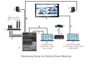 Laptop 6 also manages the sound inputs into and out of Zoom from/to the mixer. This is what allows the Zoom participants to hear what is said through the microphones and also allows the people in the room to hear the Zoom participants through the speakers in the room.